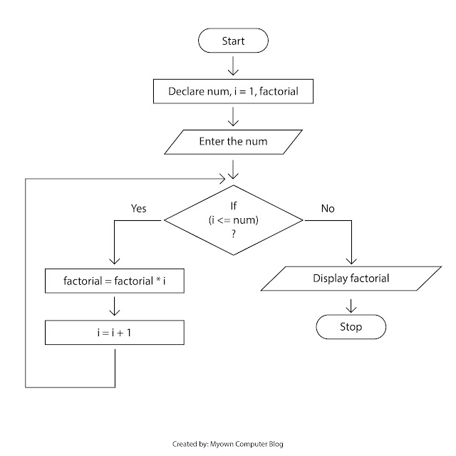 Write an algorithm AND draw a flowchart to find factorial of given number.